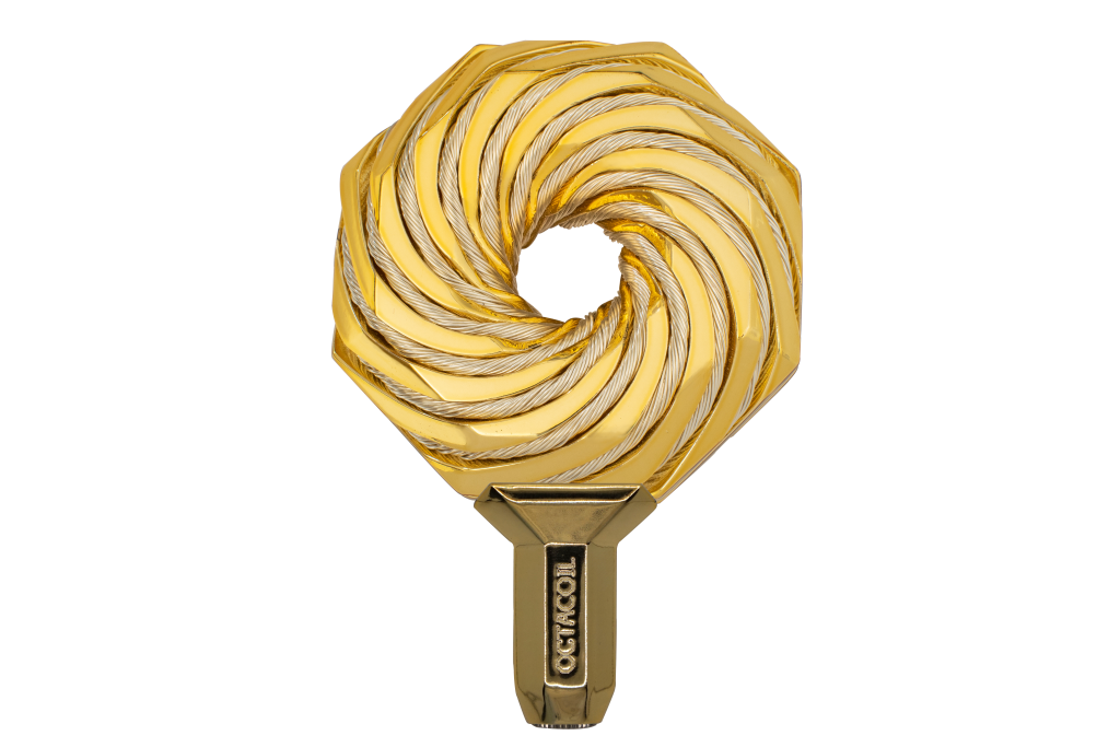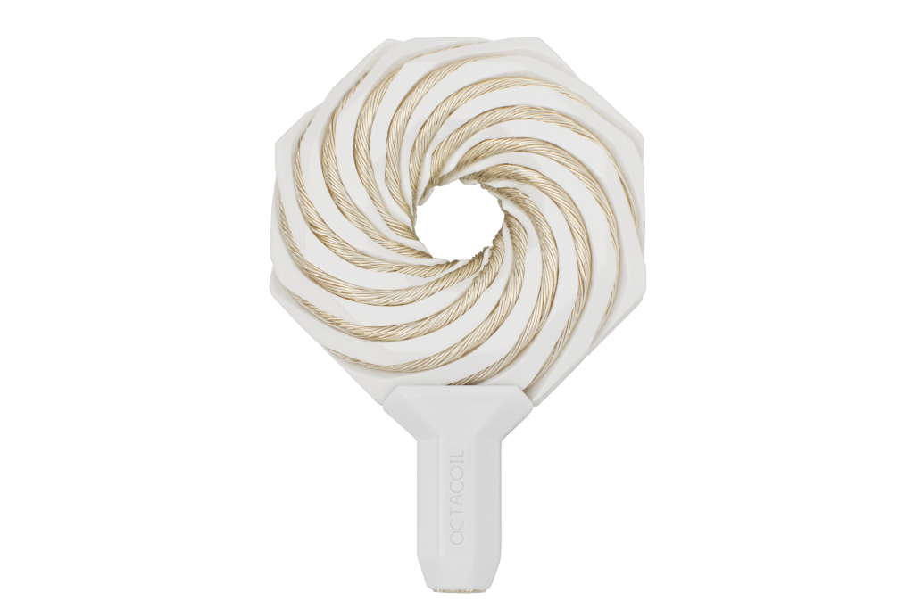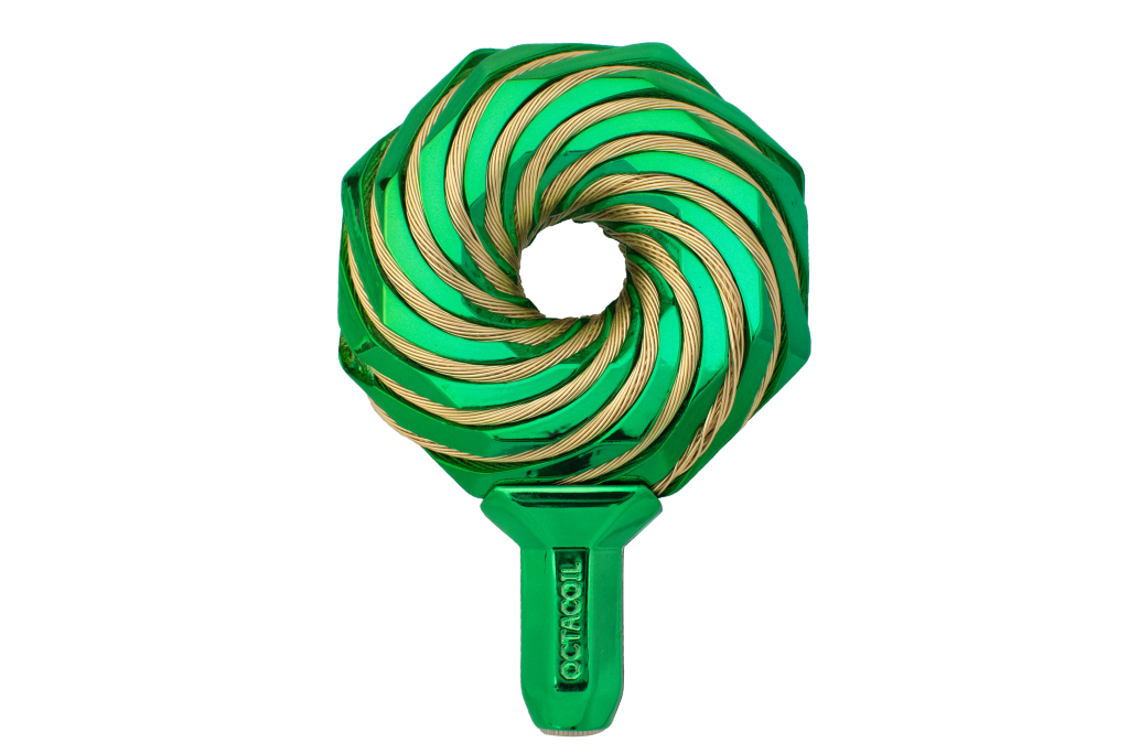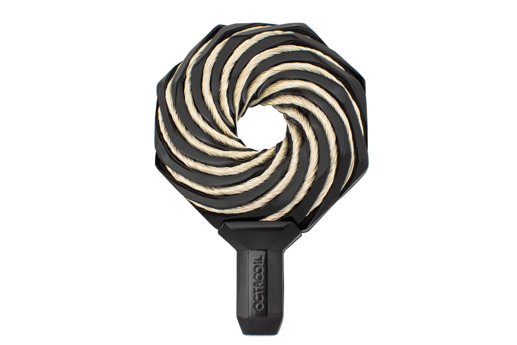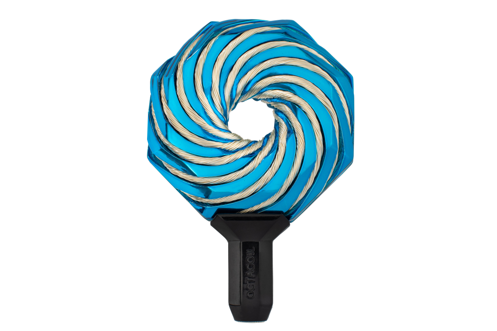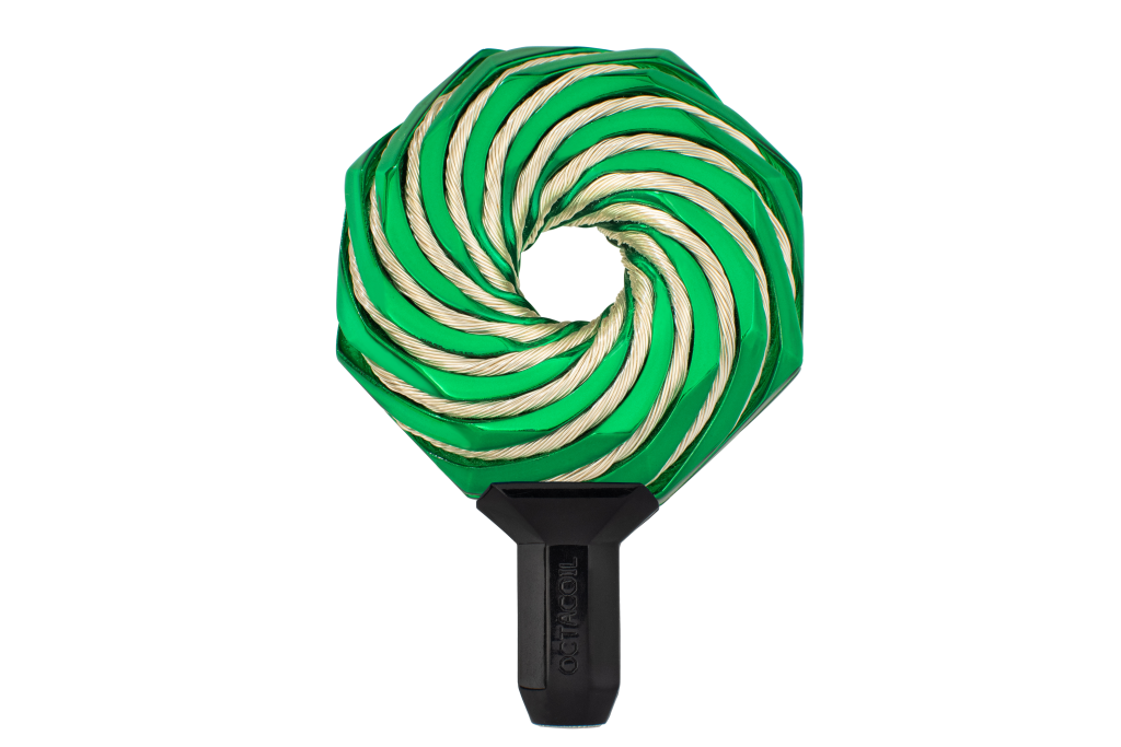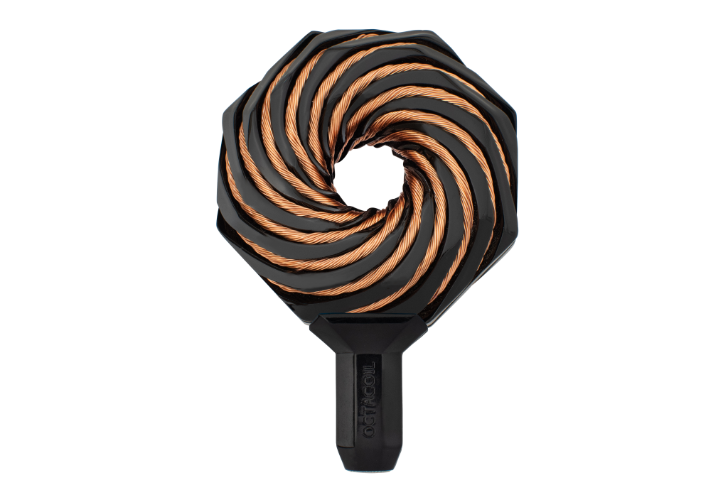 The OctaCoil™ is a Rodin Coil with left-handed (CCW), 12-spiral twist designed to produce health-promoting magnetic fields. It features twisted bundles of copper magnet wire wrapped in a spiral pattern around a toroidal, polymer core. This particular geometry works to amplify the magnetic field strength in the center of the structure. The name, “OctaCoil” stems from the octagonal styling of the profile and cross-section of the core.