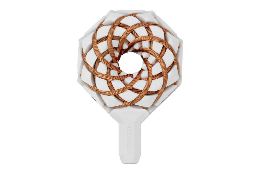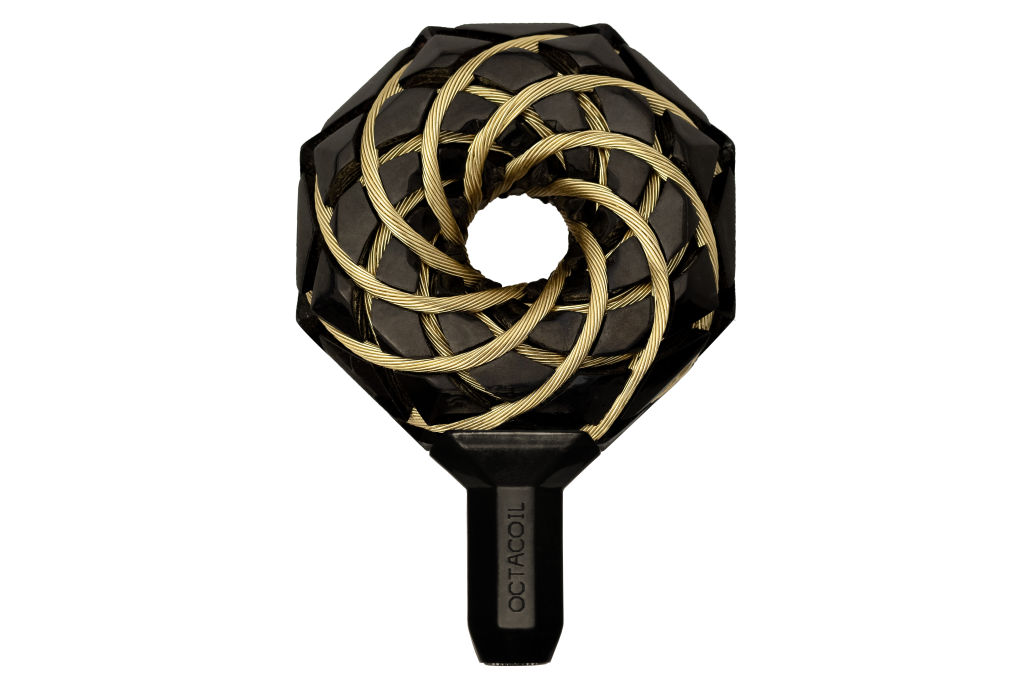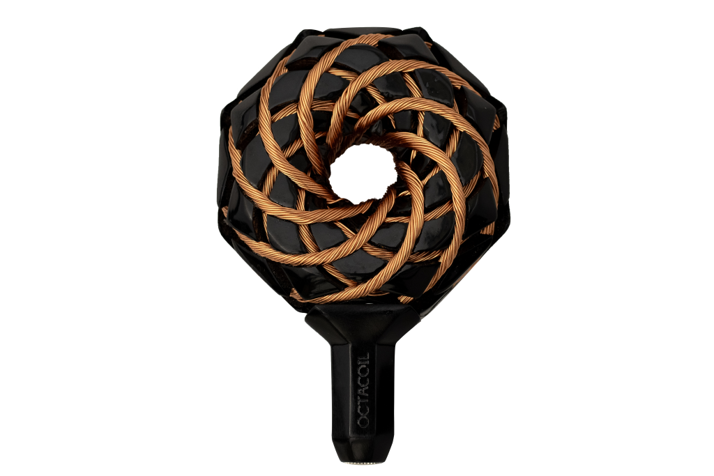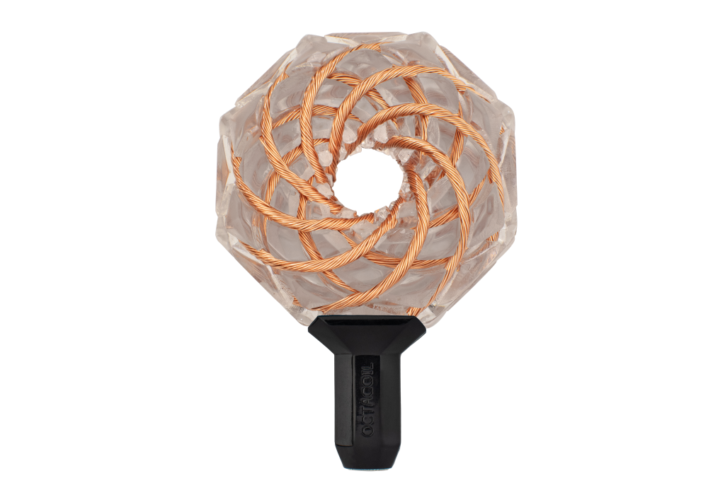 The OctaCoil™ DD (Dual Direction) is a Rodin Coil with two layers of bundled copper magnet wire wrapped around the toroidal polymer core using 8-spiral twists, one layer with a right-hand twist and the other with a left-hand twist. The dual layered coil pattern produces a greater magnetic flux density than the single direction spiral, resulting in a 1.4 fold increase in effective magnetic field strength. This particular geometry works to amplify the magnetic field strength in the center of the structure. The name, “OctaCoil” stems from the octagonal styling of the profile and cross-section of the core.