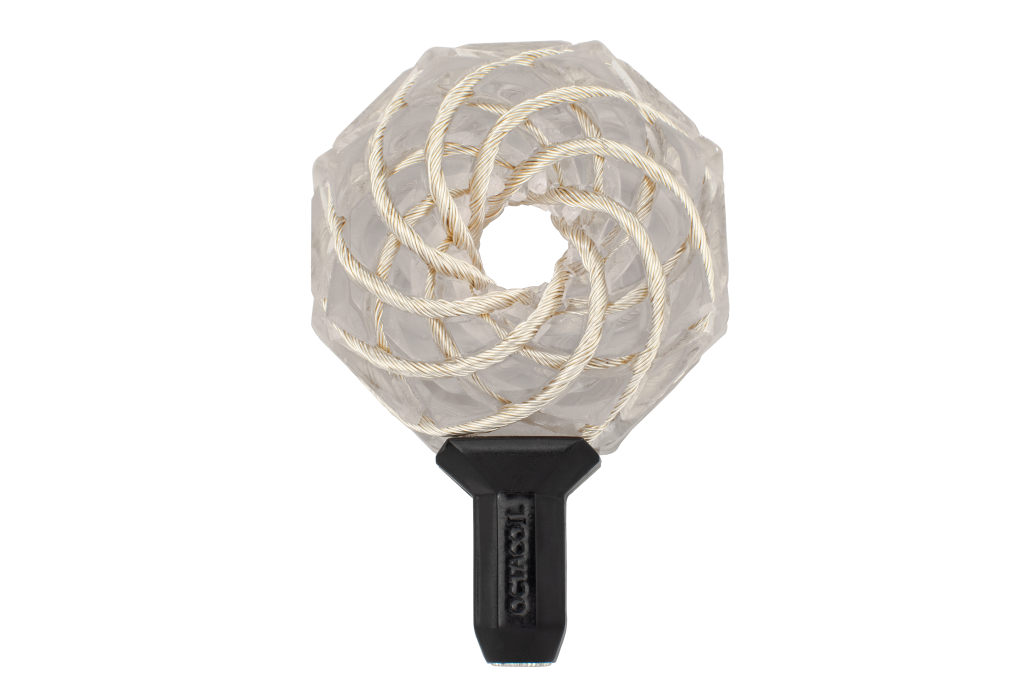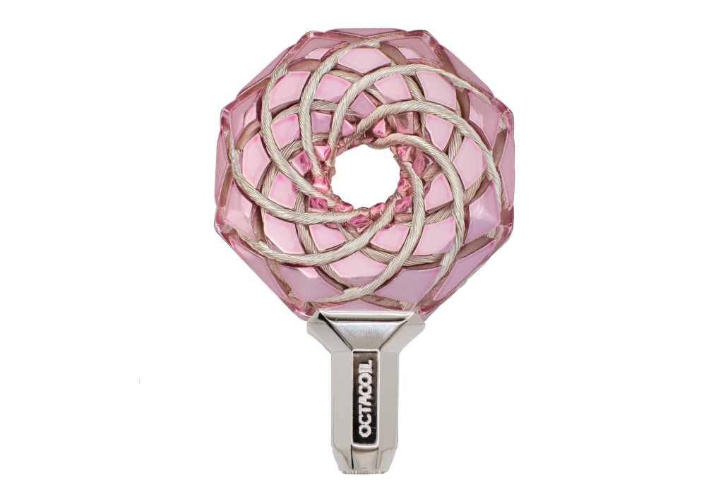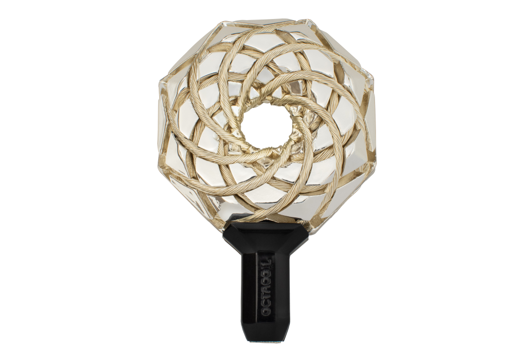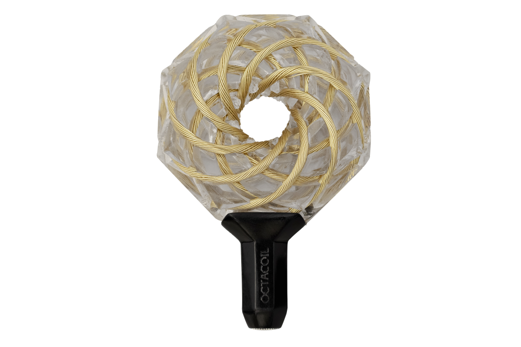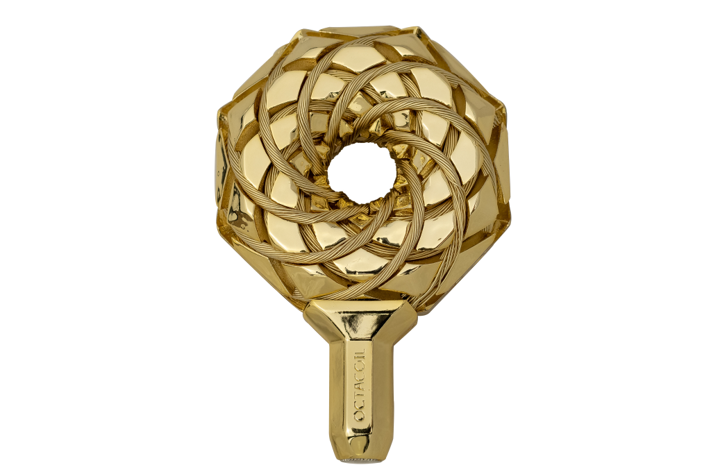 The OctaCoil™ DD (Dual Direction) is a Rodin Coil with two layers of bundled copper magnet wire wrapped around the toroidal polymer core using 8-spiral twists, one layer with a right-hand twist and the other with a left-hand twist. The dual layered coil pattern produces a greater magnetic flux density than the single direction spiral, resulting in a 1.4 fold increase in effective magnetic field strength. This particular geometry works to amplify the magnetic field strength in the center of the structure. The name, “OctaCoil” stems from the octagonal styling of the profile and cross-section of the core.