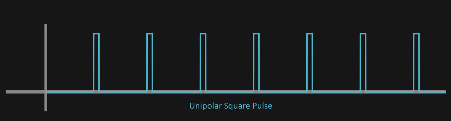 The waveforms used to generate beneficial PEMFs are time-varying electrical signals that come in many different forms. While signals can be varied in infinite ways, there are a few key variables used to define them: 1) Waveform/Pulse Shape, 2) Duty-Cycle (Pulse Width), 3) Pulse Frequency, and 4) Polarity. The unipolar square pulse shown in this image is one common type used.